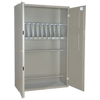 - Сейф двухсекционный, на 10 стволов, оборудован 3-мя полками под прицелы и 10-ю отсеками для магазинов.