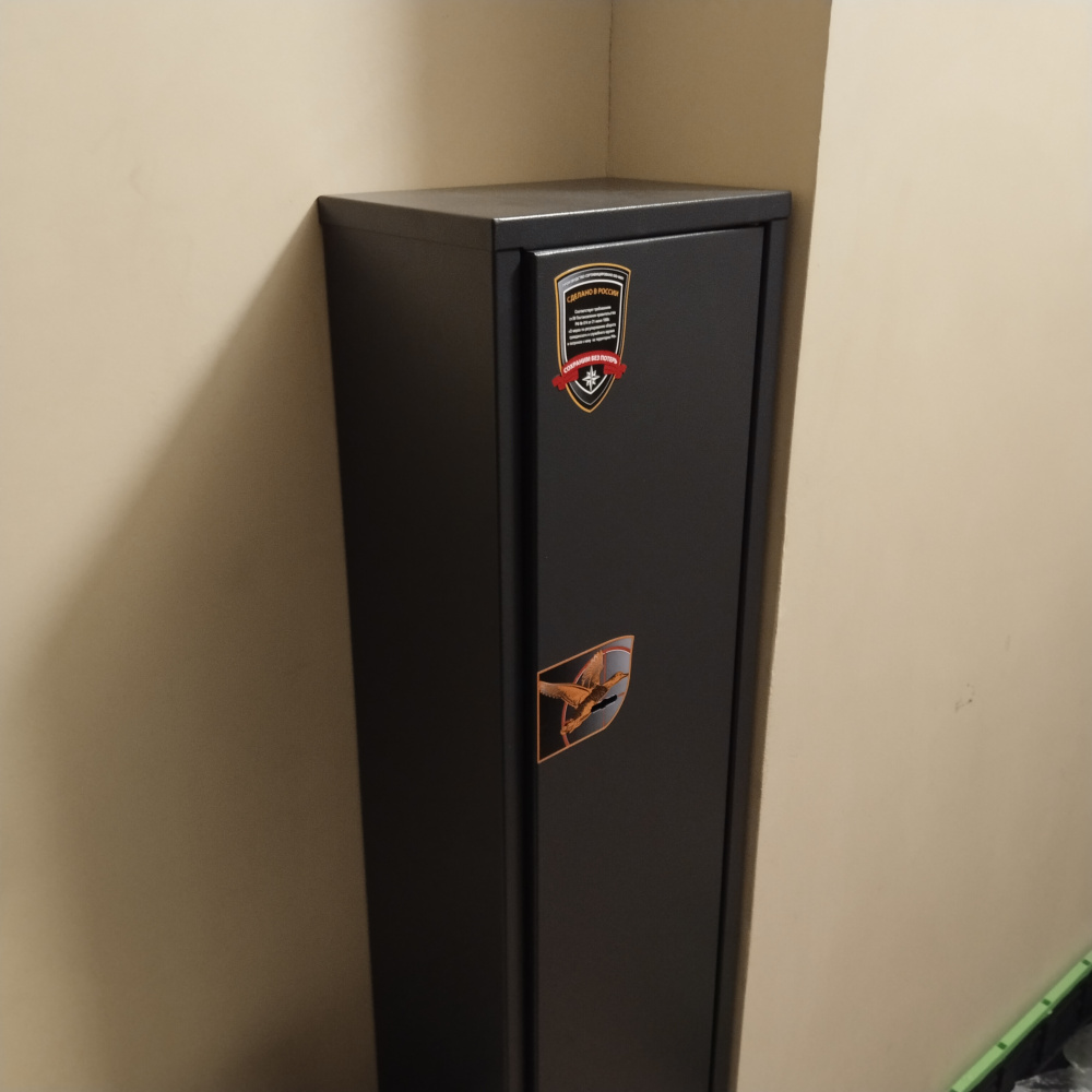 Подходит под 2 ствола. Отдельно есть ящик для патронов. Привезли быстро.Не тяжелый. прикручивается к стене изнутри. замки добротные. Росгвардию сейф устроил. Документы оформили.