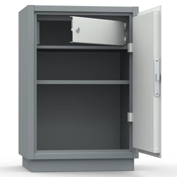 - Вся линейка бухгалтерских шкафов окрашена в два цвета: корпус - RAL 7011, дверь — RAL7035.